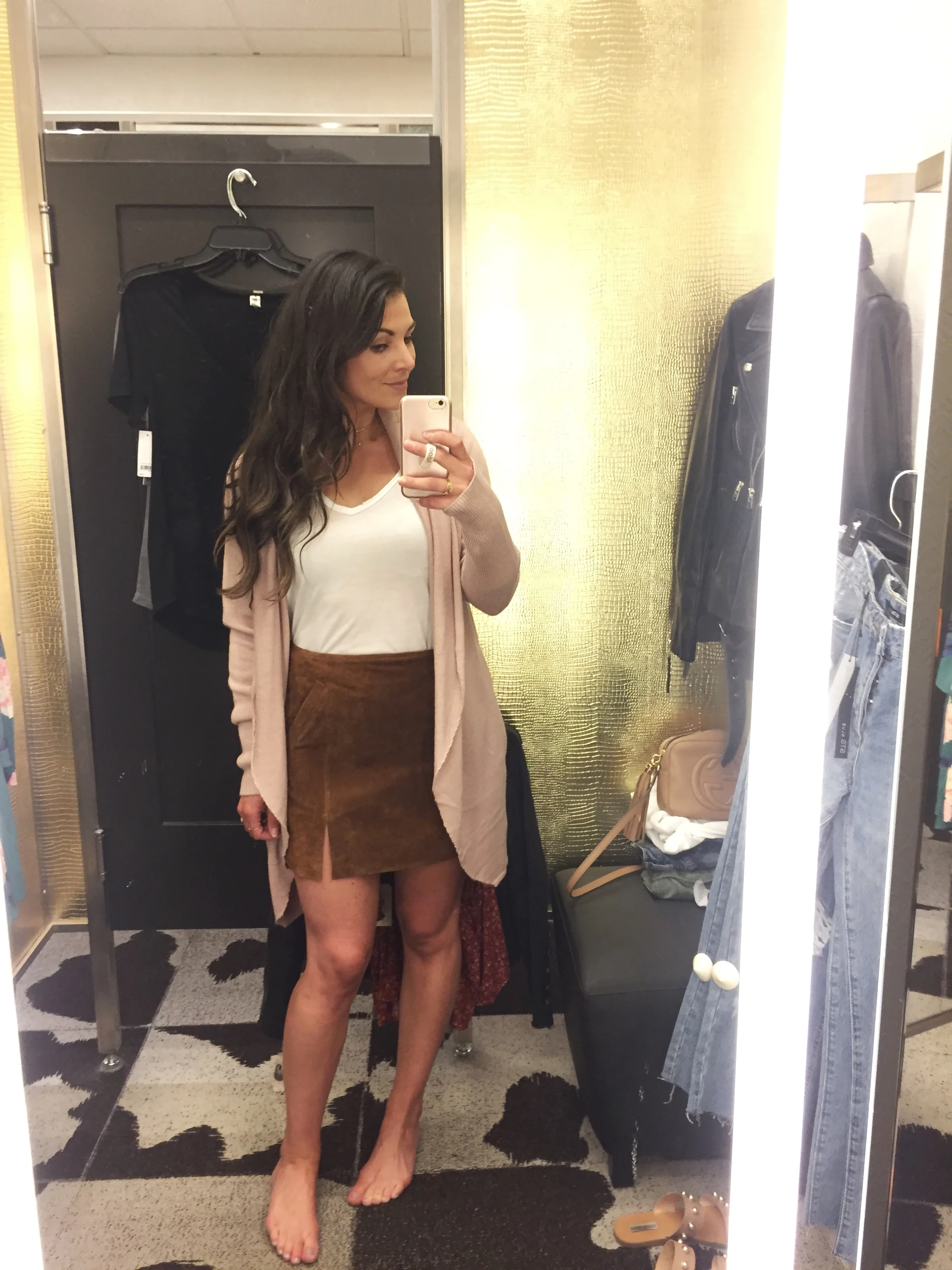 BLANK NYC Suede Miniskirt: Fits true to size, the fit is extremely flattering and comfortable (don't ride up), and the slit isn't too revealing. Also comes in a wine color and it's only $64 during the sale!