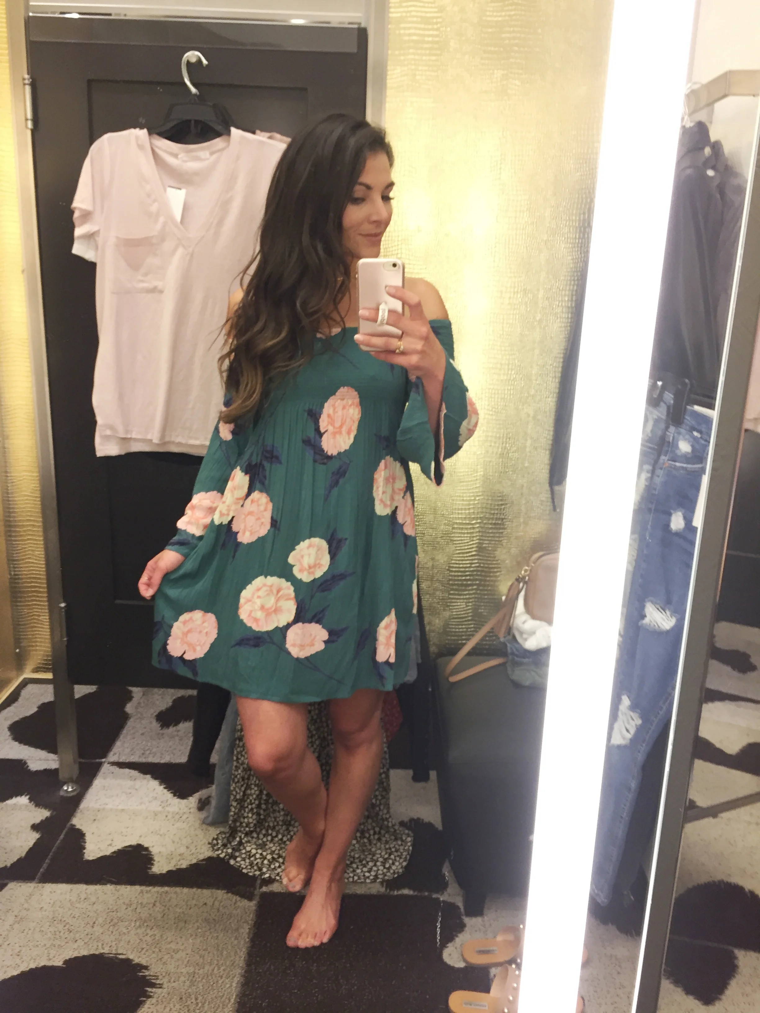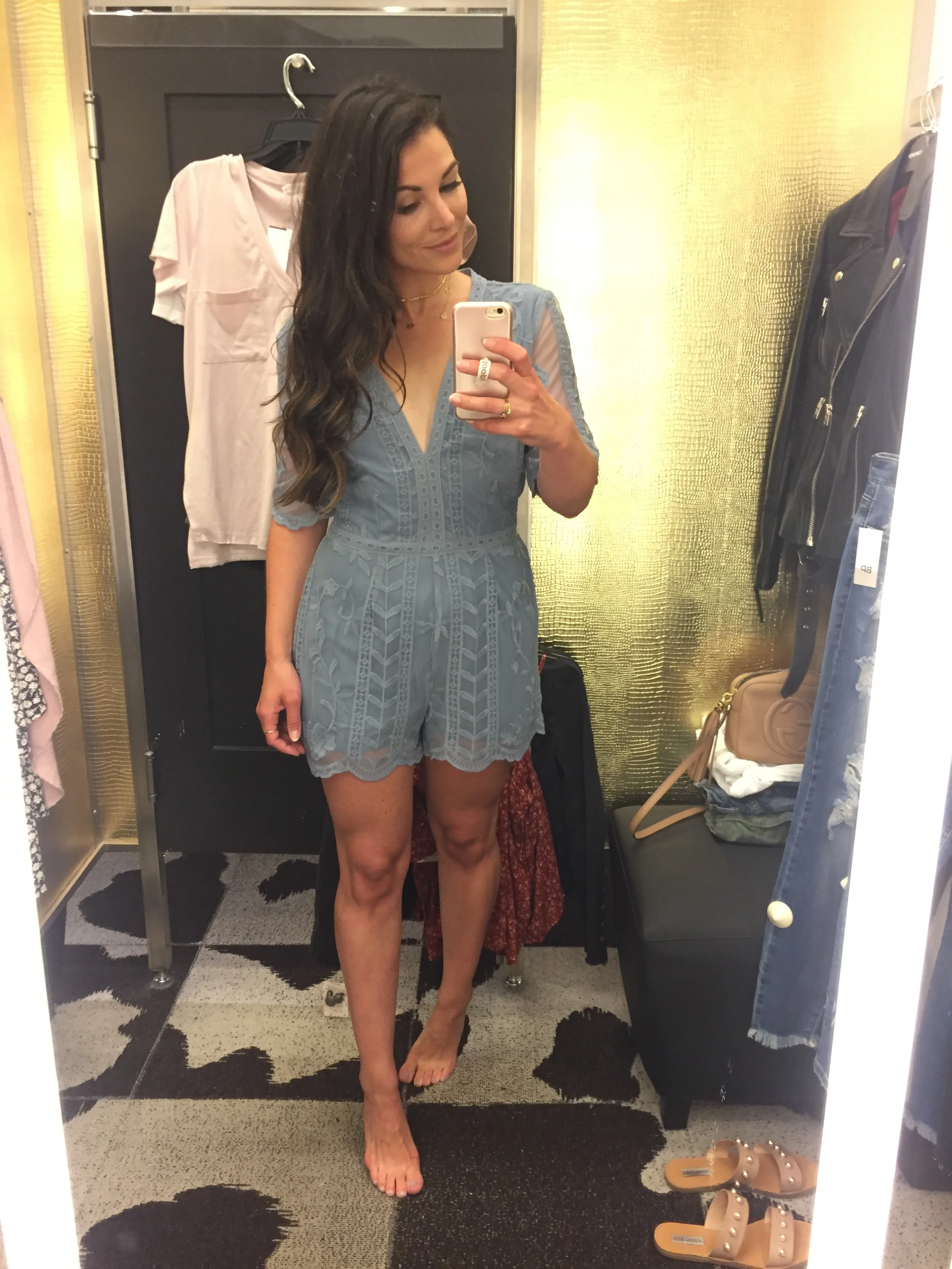 Socialite Plunging Lace Romper: Size up (wearing a size Medium), super cute for a summer wedding and with a cardigan in the fall. Comes in 2 other colors and is under $50.