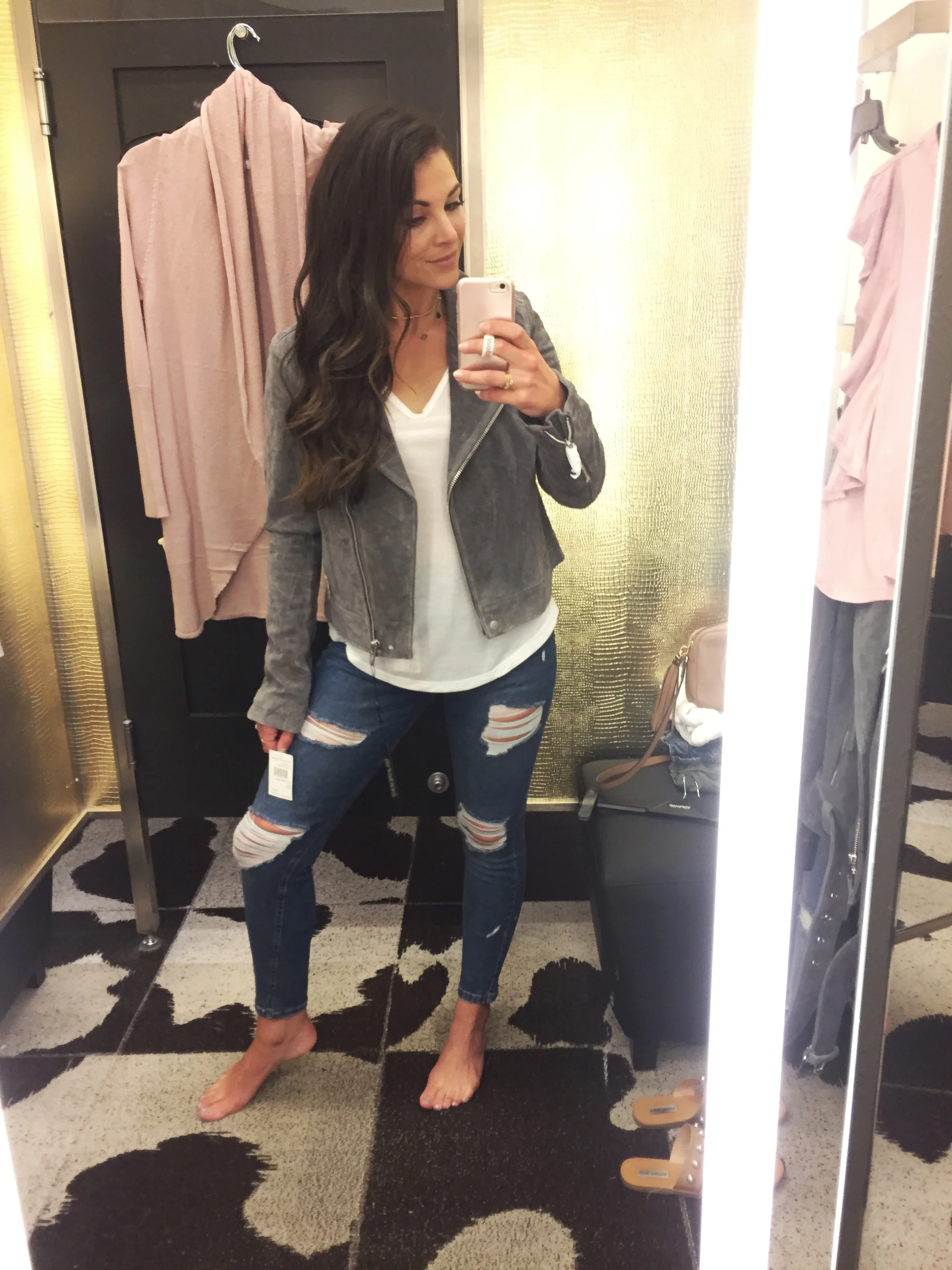 Topshop Moon Suede Biker Jacket: Size up (wearing size 6), perfect for fall and winter, nice medium gray color. On sale for $219.