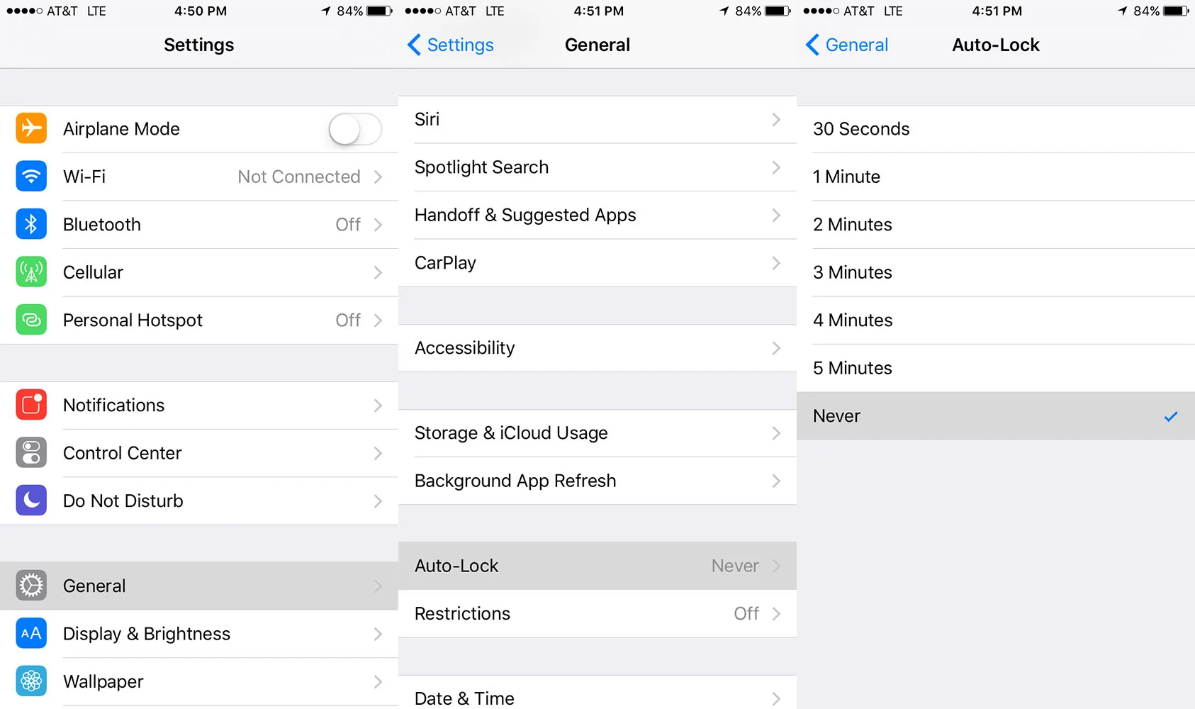 If this is your first time doing a HIIT workout like this, try 20-30 minutes to start (so 15 minutes of jumping rope, 15 min rest). I'm up to 40-50 minutes after doing this once a week for a couple of months, but it's still very challenging! Since I don't have a stopwatch, I just use my iPhone to track my time. First, I go to my settings and turn the auto lock to "never."