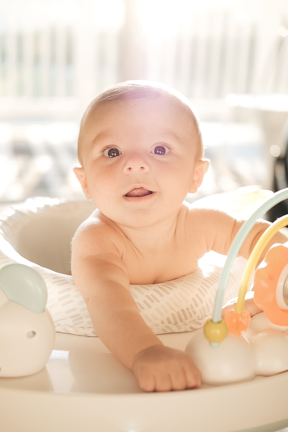 The first two weeks at daycare he was extremely clingy to me when we got home. He would also breastfeed for up to an hour both times before bed (5:30pm and 7:30pm). He’s gotten better and will finally let me put him down long enough to do some chores after we get home so that’s good! When we get home, I put him in this activity center so I can pump and clean all of my pump parts before feeding him. He loves to be upright and the toys on the activity center keep him occupied.