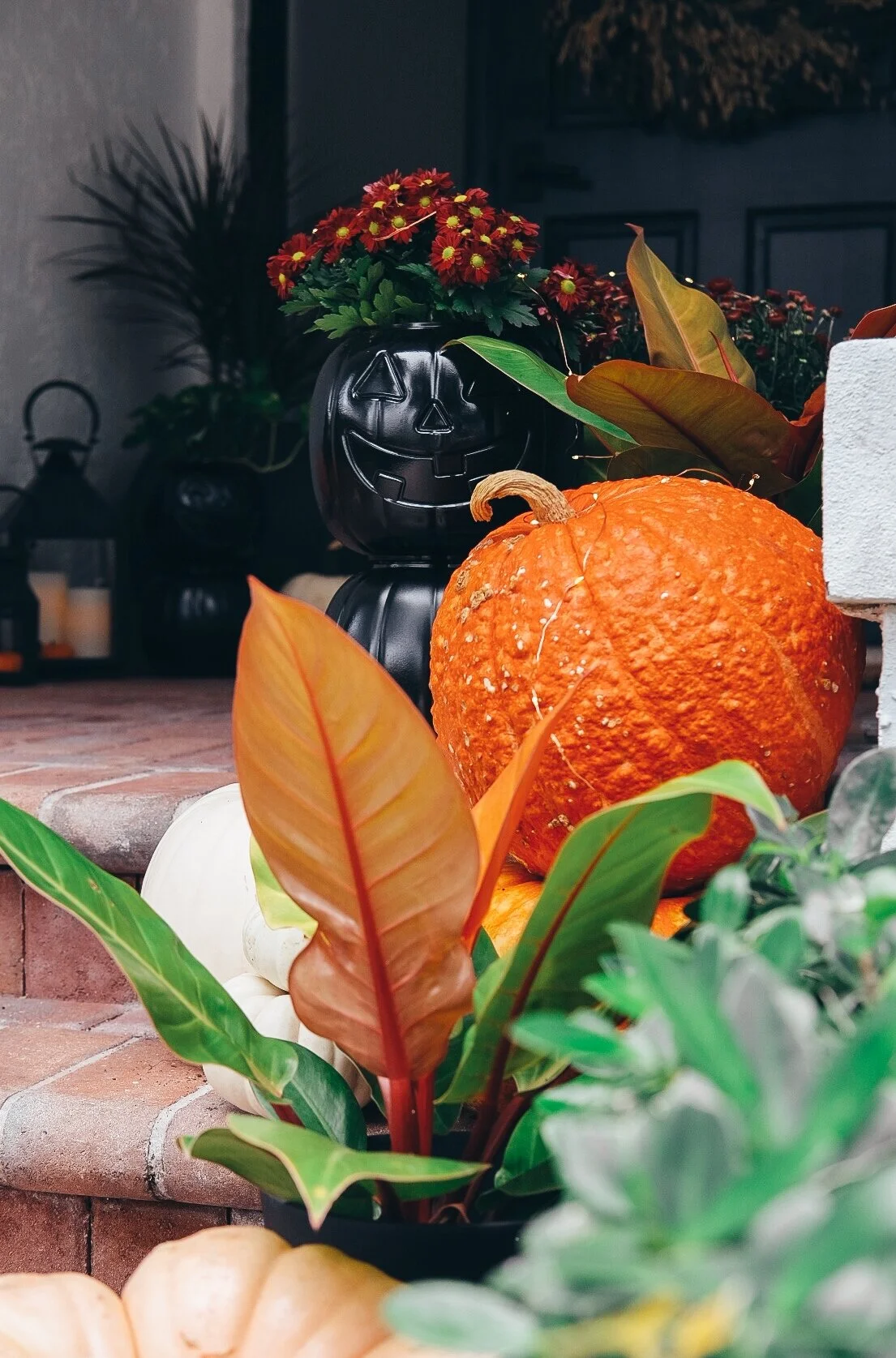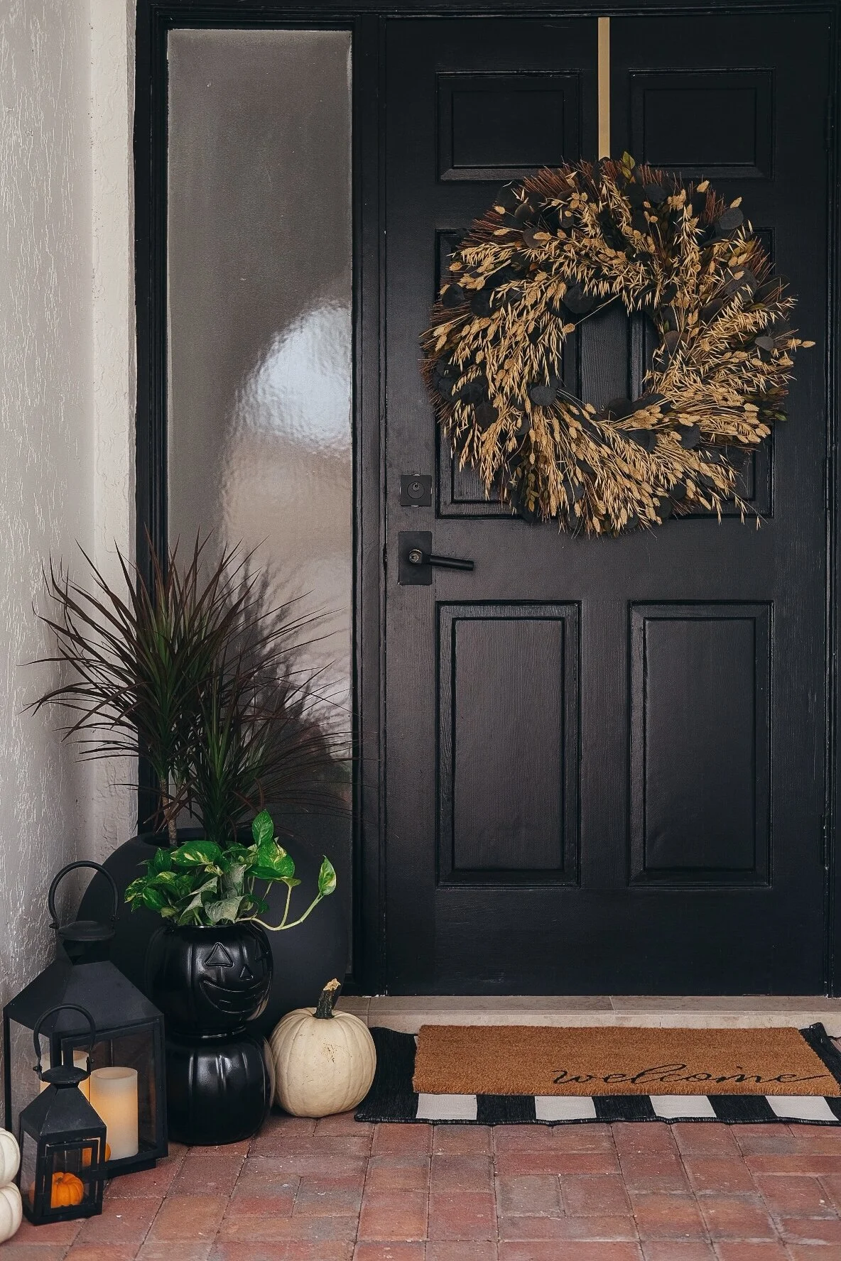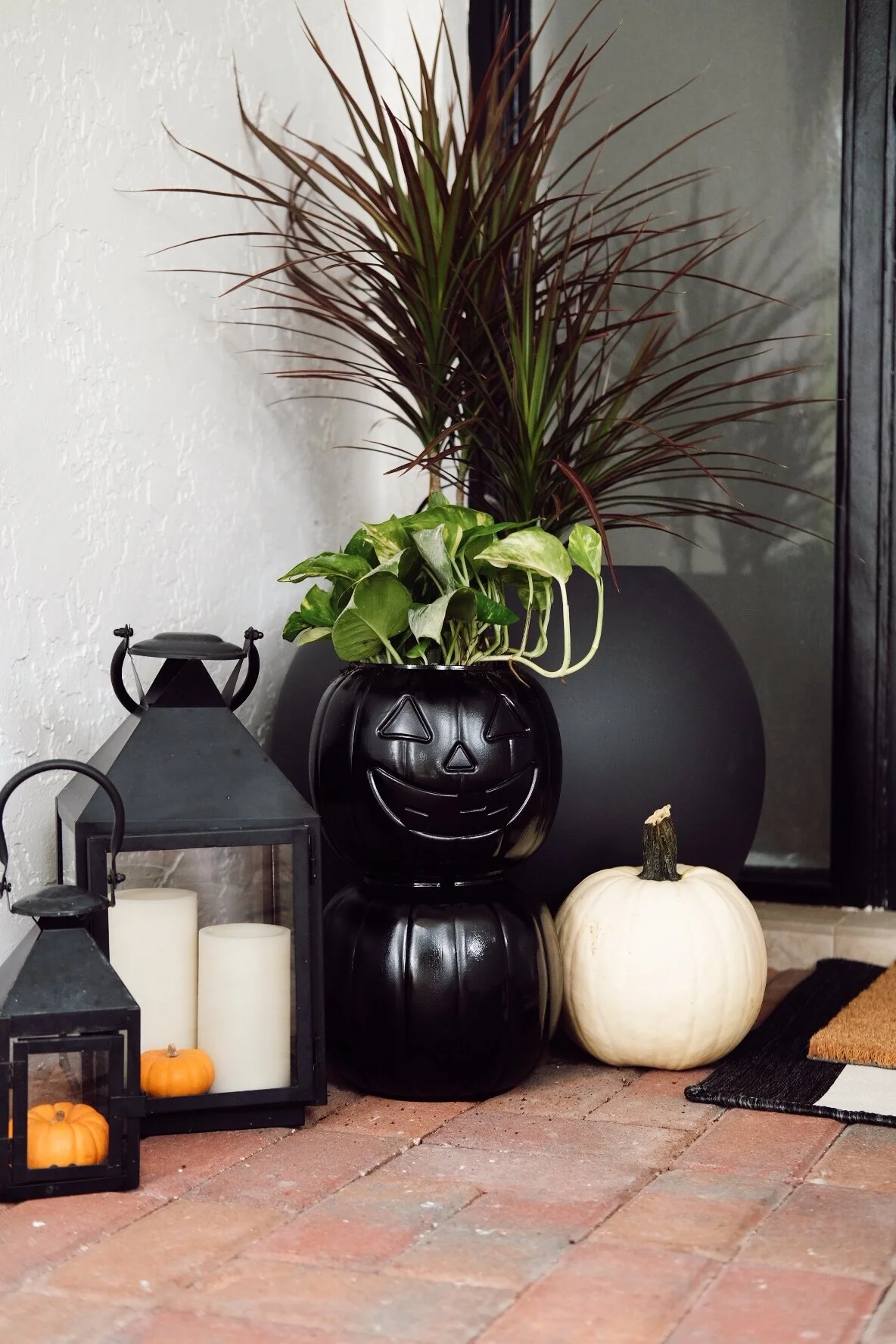 SIMILAR DOORMAT SET // SIMILAR LANTERN SET // LED CANDLES WITH REMOTE // SPHERE PLANTER // SIMILAR WREATH // WREATH HOLDER // DOOR KNOB // OUTDOOR LIGHT