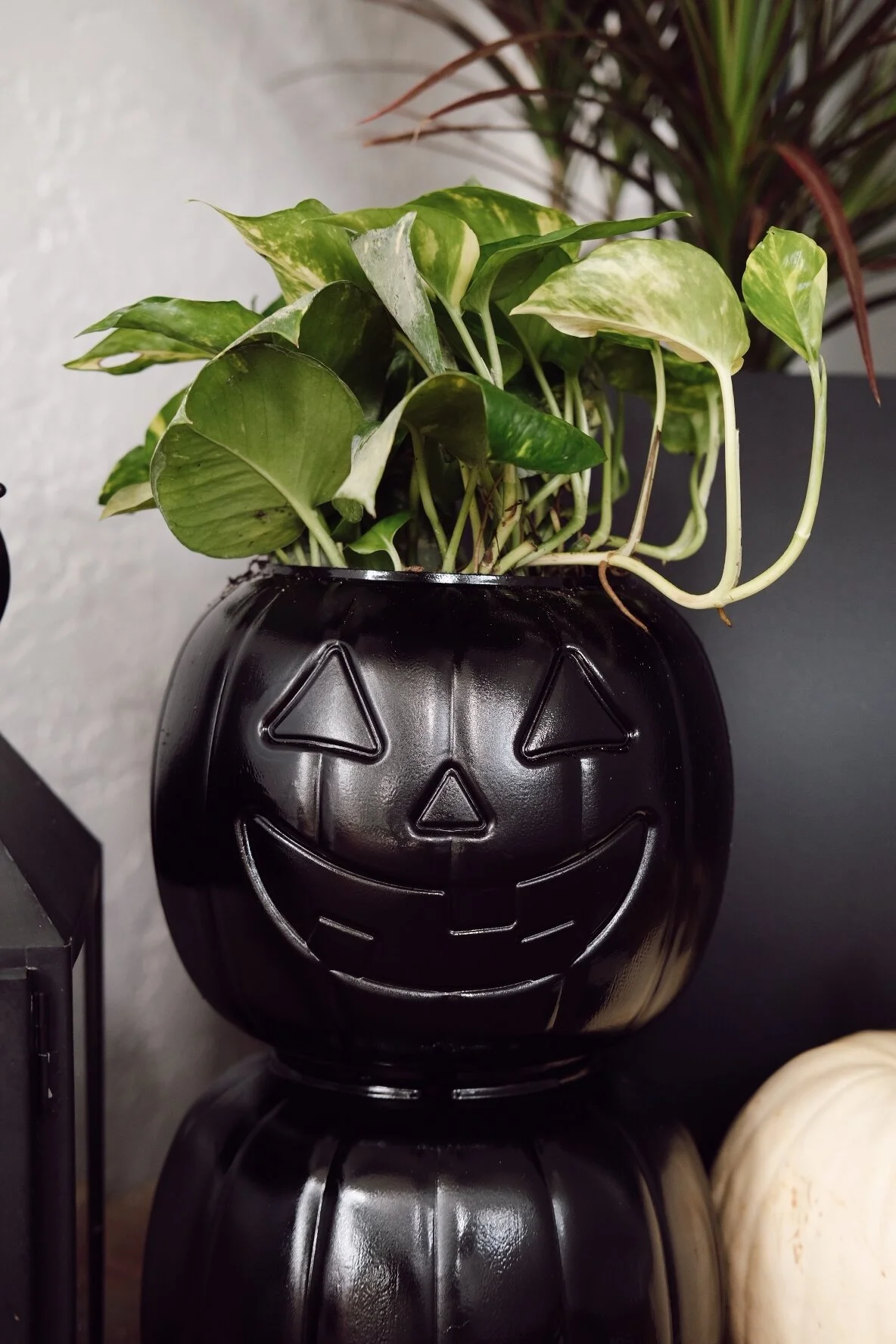 First, you’ll need to take off any stickers. Glue the pumpkins together with one side facing the back. I put some rocks in each one so that they didn’t blow over while the glue dried. I waited 24 hours to drill holes for drainage. I drilled about 8 holes in each one- make sure the bit goes through both pumpkins! After that, I spray painted them with 3 coats of gloss. I used gloss so that you could still see the pumpkin face in the sun! This DIY is so easy- tag me on Instagram stories if you try it!